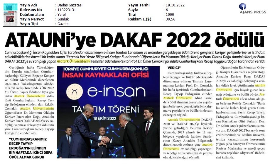 Cumhurbaşkanlığı İnsan Kaynakları Ofisi tarafından düzenlenen e-İnsan Tanıtım Lansmanı ve ardından gerçekleşen ödül töreni, gençlerin kariyer gelişimlerine ve istihdam edilebilirliklerine önemli bir katkı sunan “Yetenek Her Yerde Bölgesel Kariyer Fuarlarında” Öğrencilerin en memnun olduğu kariyer fuarı olarak Doğu Anadolu Kariyer Fuarı DAKAF 2022’ye ev sahipliği yapan Atatürk Üniversitesini temsilen ödül